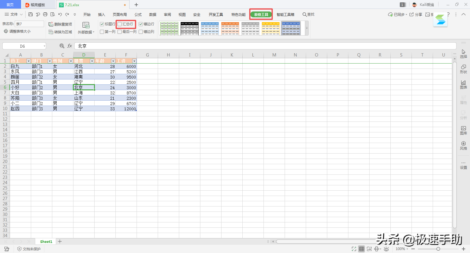 在工具栏上方找到【表格工具】选项卡,然后点击进入,接着找到【汇总行】选项并进行勾选,此时表格就会自动增加一行汇总数据。