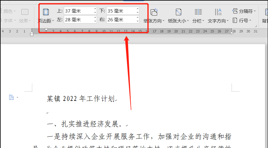 步骤三:设置页边距。在“页面布局”中,分别将页边距设置为:上37mm,下35mm,左28mm,右26mm。