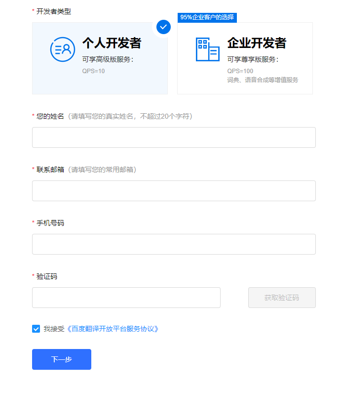 第一步:注册百度翻译平台开发者账号。网址:https://fanyi-api.baidu.com/。