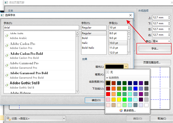 我们还可以对页眉页脚的字体进行设置,点击【字体】,会弹出一个字体设置串口,除了可以选择字体、字形、字号之外,我们还可以设置字体的颜色线宽等,我们根据自己的需要选择,然后点击确定即可。
