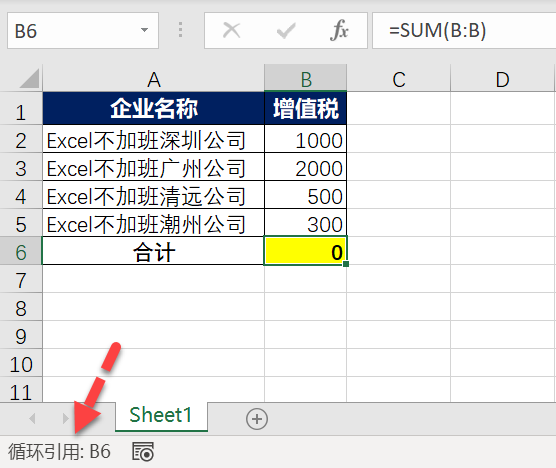 高版本循环引用的时候,都会在状态栏左下角提示。引用B列的区域,会将B6循环引用进去,导致出错。