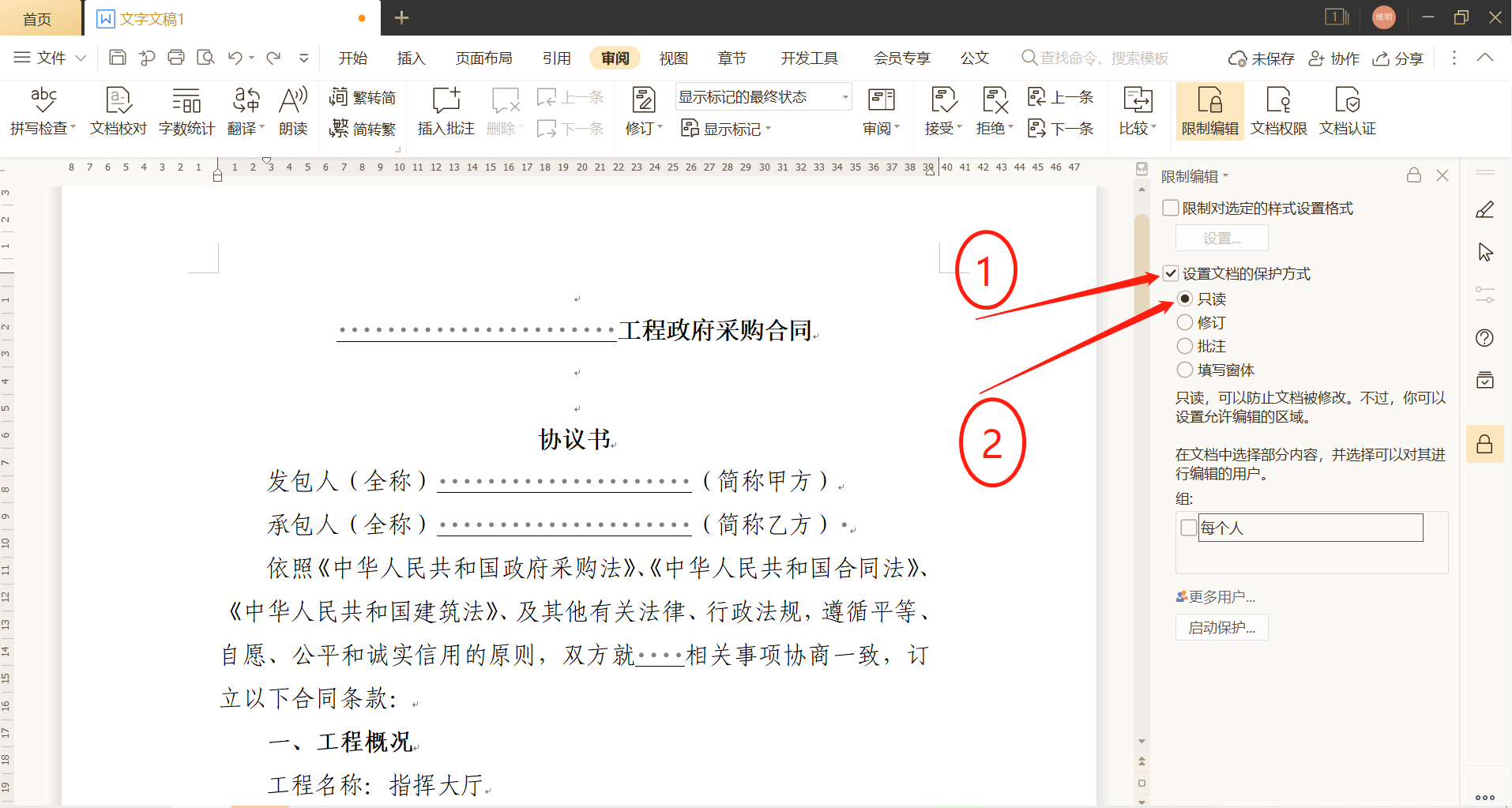 3.先看效果图,对需要客户审核修订的内容通过阴影+左右边框的形式进行提示,其他不提示的内容也可以自由修改第一步:点击“审阅”菜单-点击“限制编辑”项第二步:点选“设置文档的保护方式”-点选“只读”项第三步:鼠标选中需要提示审核修订的内容,然后点选右侧的“每个人”项,选中内容即出现阴影+方框的提示其他两处需提示的内容用同样的方法就能轻松秒杀
