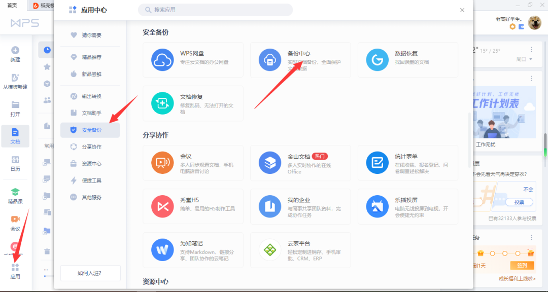 第一步:打开WPS的主页,点击左下角的“应用”选项卡,弹出一个窗口,选择“安全备份”,再点击“备份中心”。