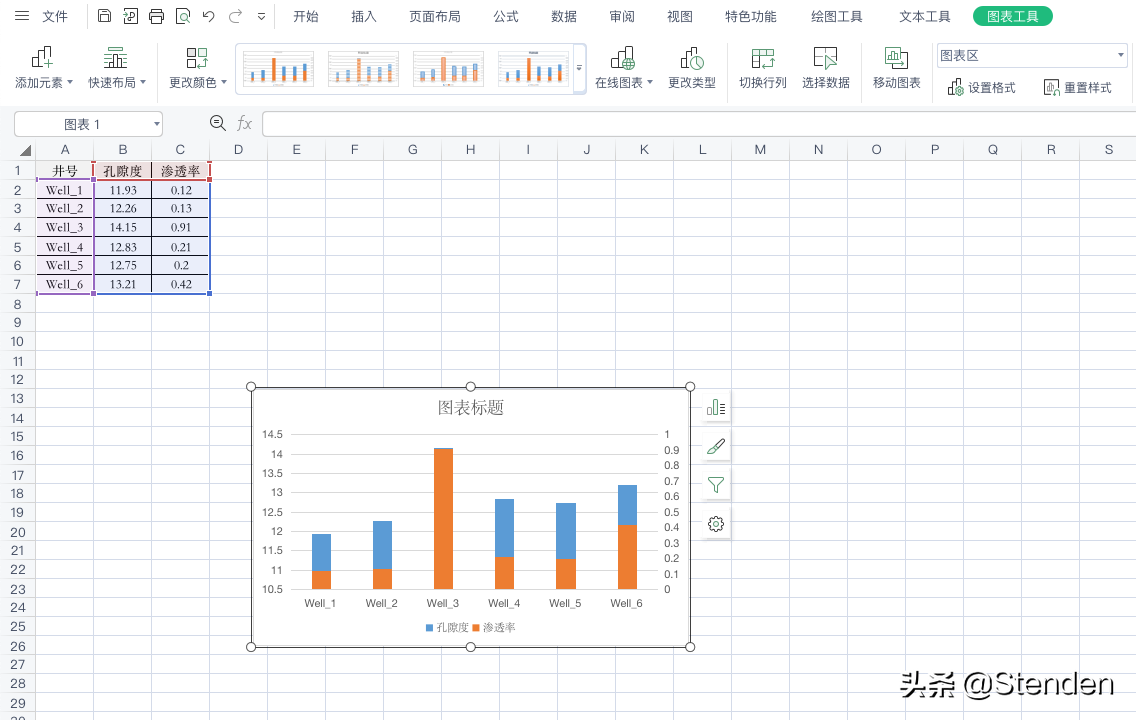 Step. 06 设置图表元素属性。包括坐标轴、轴标题、数据标签、网格线、图例等,对于图例中空值系列,鼠标左键单击删除即可。设置轴标题、数据标签的字体格式,坐标轴与绘图区的线条样式后,完成最终的双纵轴簇状柱形图可视化表达。