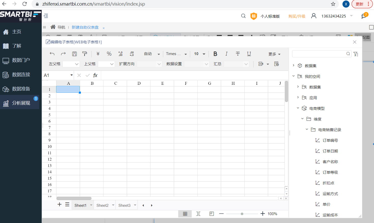 进入智分析的线上表格主界面后,便看到了类似WPS里的表格界面,可以说这个样式基本是复制了WPS的界面,普通人可以快速入门。那么智分析的线上表格可以做哪些事情呢?主要有以下三个: