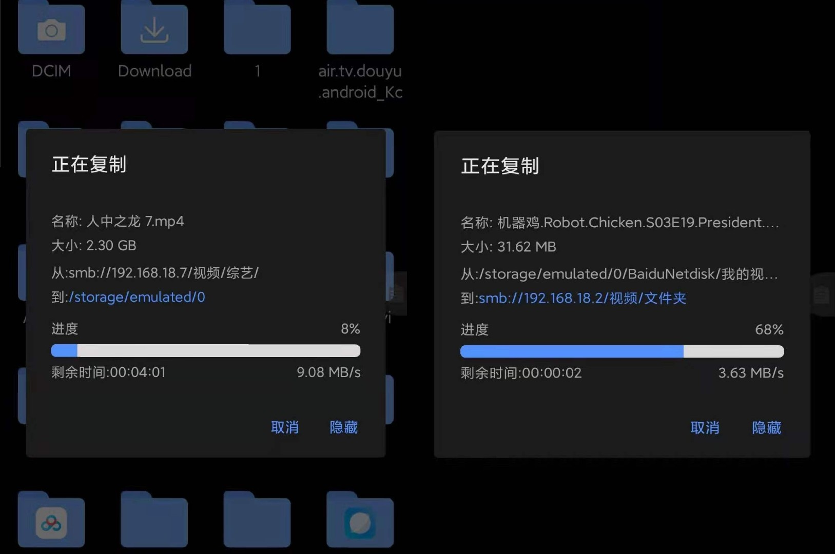 换个位置,在隔着客厅的承重墙和金属门的情况下,我们用es文件浏览器来测试手机和电脑的内网传输速度,在连接着5GHz Wi-Fi 6网络的情况下,小米10的上传速度可以达到9MB/s,下载速度可以达到18MB/s;在连接着2.4GHz Wi-Fi 6网络的情况下,上传速度锐减至4MB/s,下载速度锐减至9MB/s。