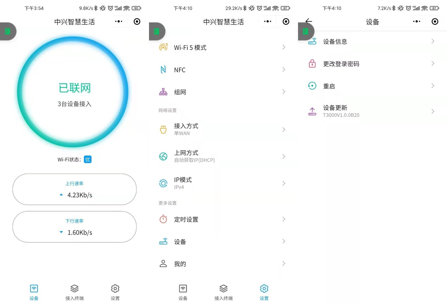 手机端的用户,也能使用“中兴智慧生活”小程序来管理路由器的状态。比起WEB管理页面,小程序的设置功能更少,但是界面设计也更直观,用户可以随手设置访客Wi-Fi、Wi-Fi 5模式,方便来客使用自家的无线网络。此外,路由器固件的升级也可以通过“中兴智慧生活”小程序完成。