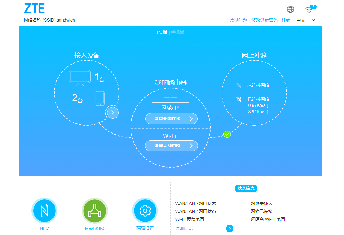 设置完成后,我们就来到了中兴的WEB管理主页。在这里,我们可以查看路由器的基本状态、接入设备等一系列参数,也能够进行诸如修改Wi-Fi名称、设置上网方式、设置路由方式这样比较简单的设置。尽管没有什么复杂的参数设置,但是这样简洁明了的设置方法可能更适合一般家庭消费者。