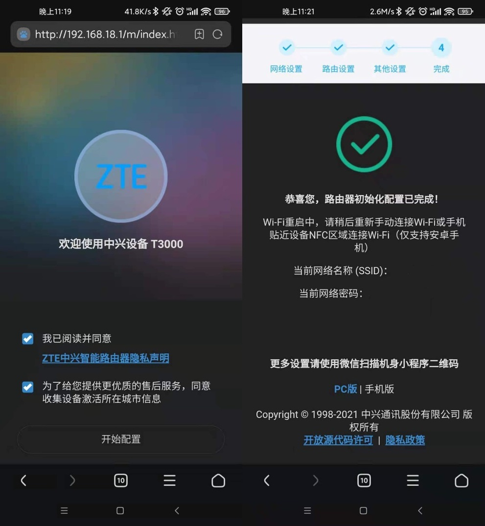 接好线缆后,我们输入192.168.18.1就可以登录WEB管理界面,中兴AX3000 Pro的初始配置不仅可以在PC、手机的浏览器里进行,也能通过专门的“中兴智慧生活”小程序进行更加详细的设置。中兴的上网引导界面会引导用户一步步操作,对新人来说还是挺友好的。