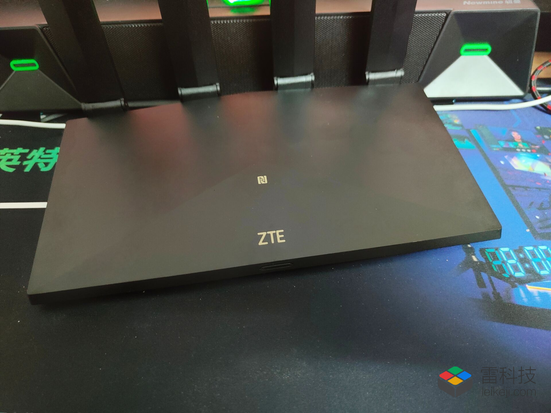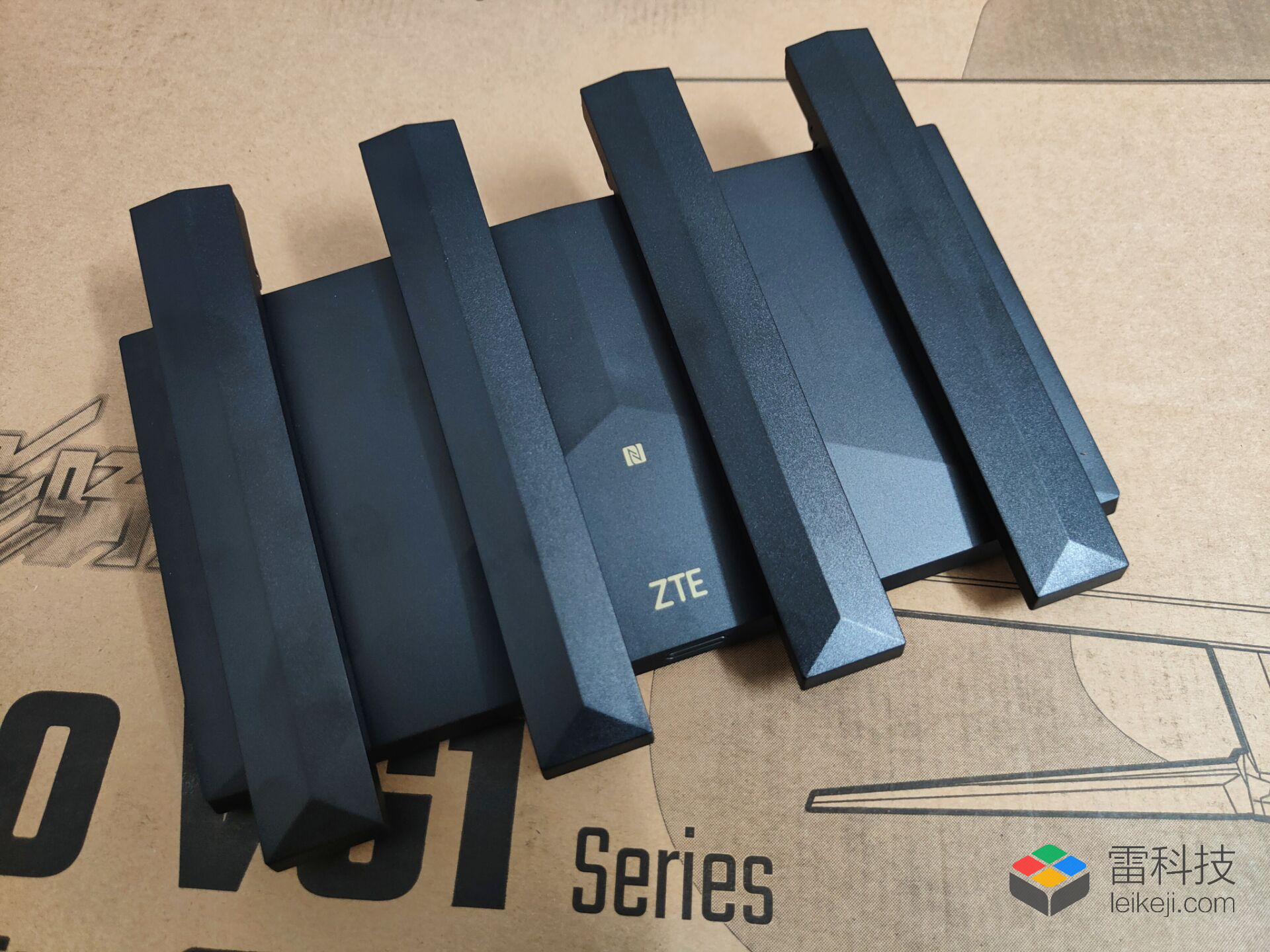 接下来我们看看产品的细节,中兴AX3000 Pro路由器采用黑色配色,整体设计简洁明朗,边缘棱角分明,线条流畅硬朗,既不是入门级路由器那种镂空的方盒子造型,也不是旗舰级路由器那种张扬而夸张的造型,放在电脑桌面上一点也不突兀,这点我是非常喜欢的。