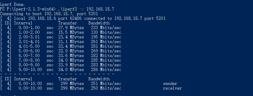 因为设备网口数量的限制,小雷在这里测试的都是“完全无线”环境下的内网传输速度。首先,利用iPerf3搭建内网测试环境,在两台电脑都连接着160MHz 5GHz Wi-Fi 6网络的情况下,两款设备之间的平均传输速度是33MB/s,可以达到250Mbps的内网速率。