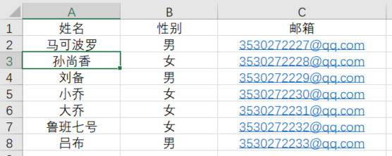 1.举例:我们现在有一份表格,里面是好友的名单,邮箱数据纯属模拟,如下所示:这里只列了7个姓名,实际可能几百个