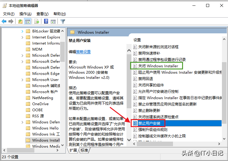 4.4、在“关闭windows installer”下面找到“禁止用户安装”