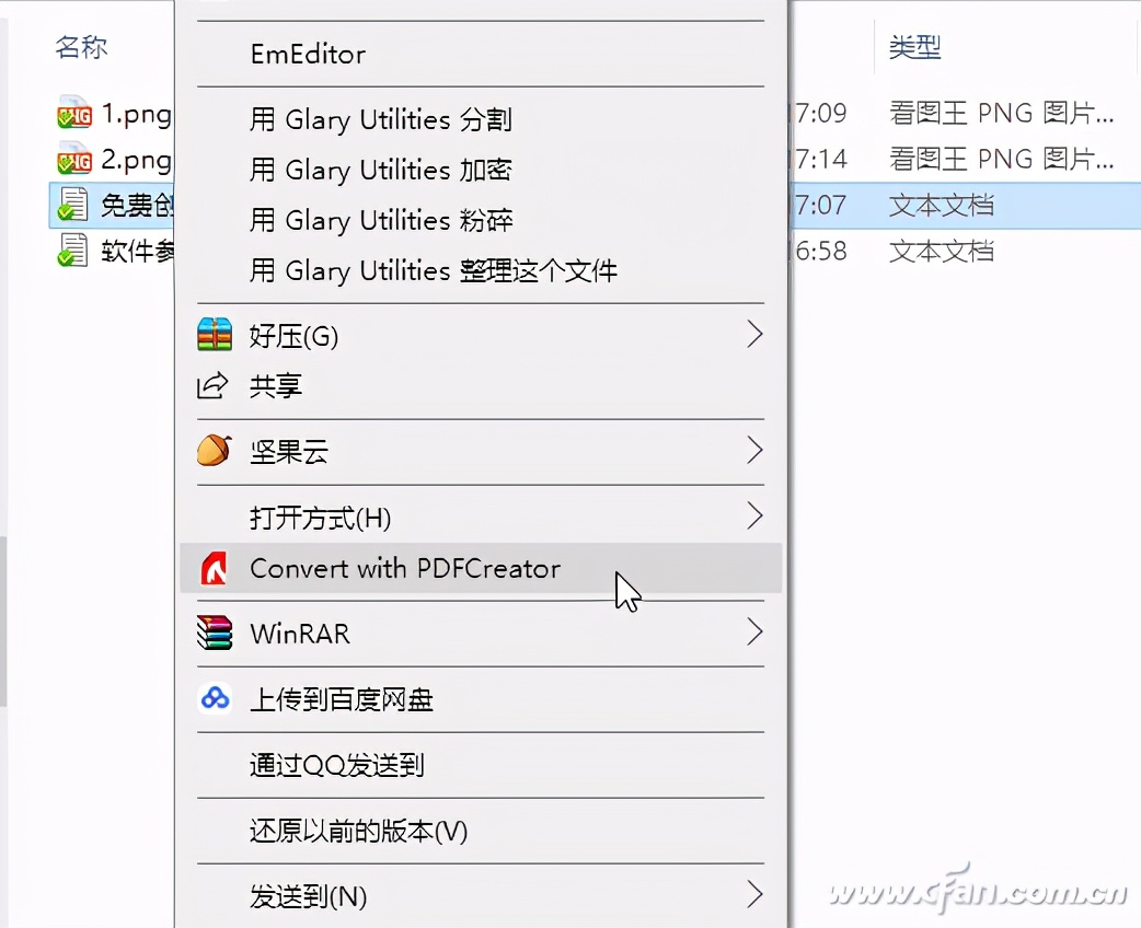 在文件资源管理器中,右键单击任意文档,然后选择Convert with PDFCreator(图3)。随后,会出现步骤1中的打印设置窗口,用同样的方法打印PDF即可。