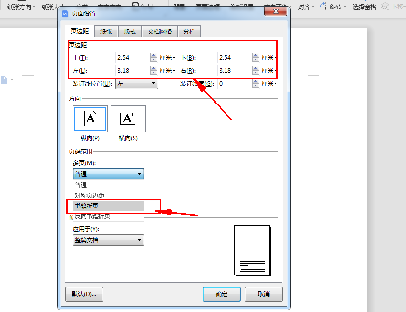 在弹出的“页面设置”对话框中选择“书籍折页”,页边距也要根据自己的需要进行调整。