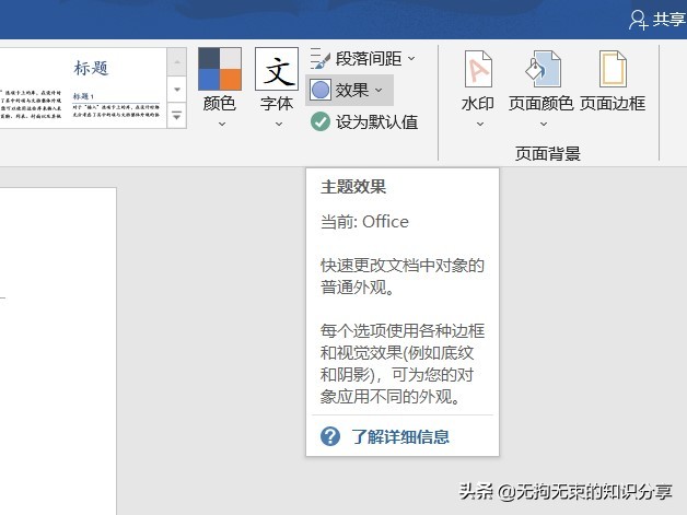 由主题、字体、颜色、段落间距、效果和设为默认值组成。