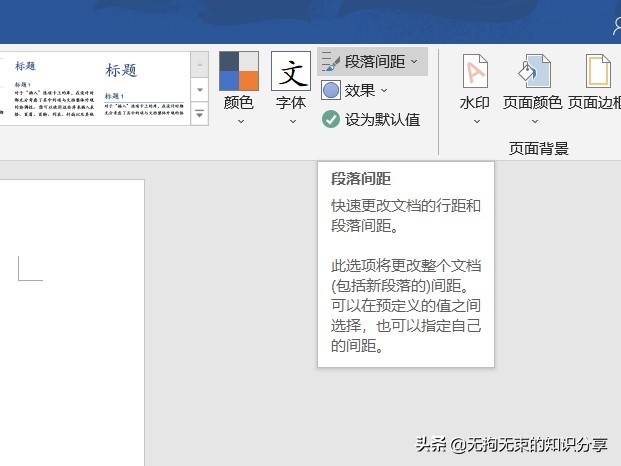4)段落间距:快速更改文档的行距和段落间距,此选项将更改整个文档间距。可预订也可指定间距。