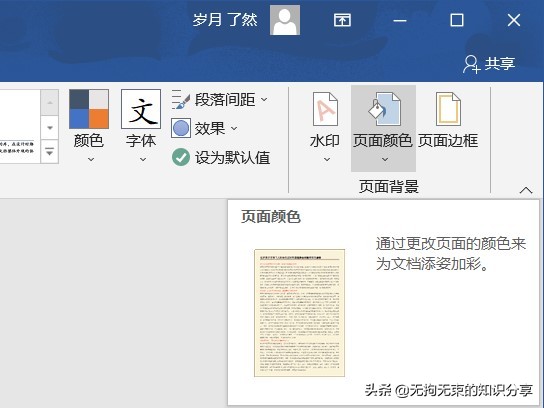 2)背景颜色:通过更改页面颜色来为文档页面更改颜色从而使文档添姿加彩。