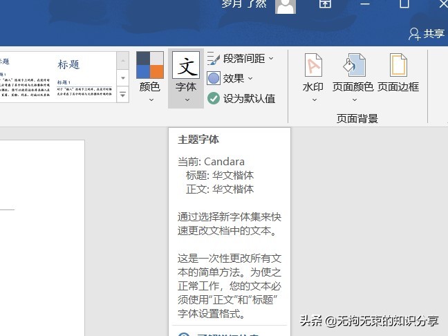 3)字体:通过选择新字体集来快速更改文档中的文本。(这是一次性更改所有文本的简单方法)。