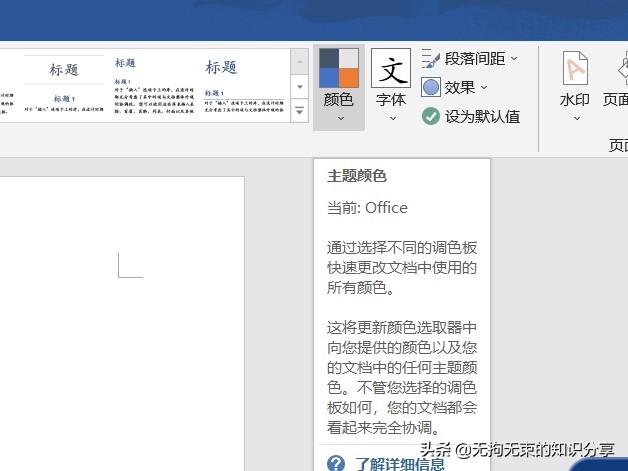 2)颜色:通过选择不同的调色板快速更改文档中的使用的所有的颜色(会更新颜色选色器中向您提供的颜色以及您文档中任何主题的颜色。不管选择的调色板如何,您的文档都会看起来非常的协调)。