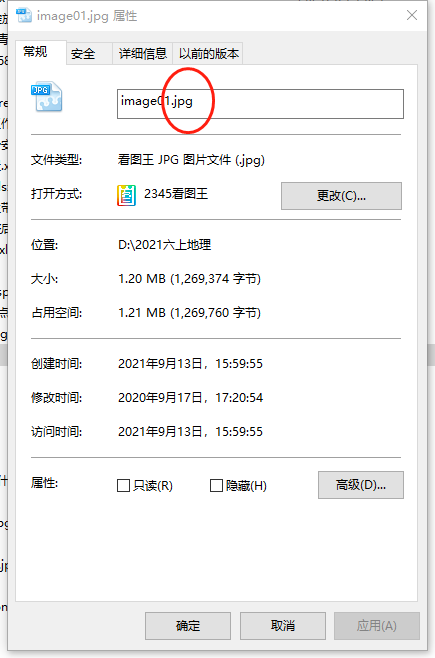 3.鼠标右键点击某张照片查看文件的后缀名,一般相机都是”.JPG“,但是有些相机可能是小写的”.jpg“或者其他格式的,如下图就是小写的,大小写是不能搞错的。(如果是大写,下面的步骤就应该改成”.JPG“)