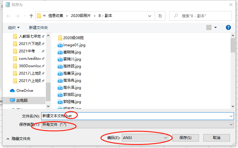 5.在包含照片的文件夹里新建一个文本文档,把第4步里面的第三列数据复制进去,文件另存为,文件名的txt改成”.bat“,按照下图设置类型和编码。