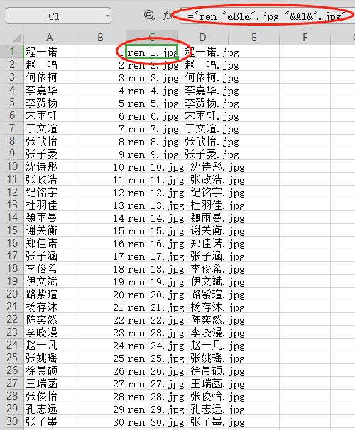 4.用电子表格合并列的办法编辑出”ren 1.jpg 某某某.jpg“,然后智能填充每一列。