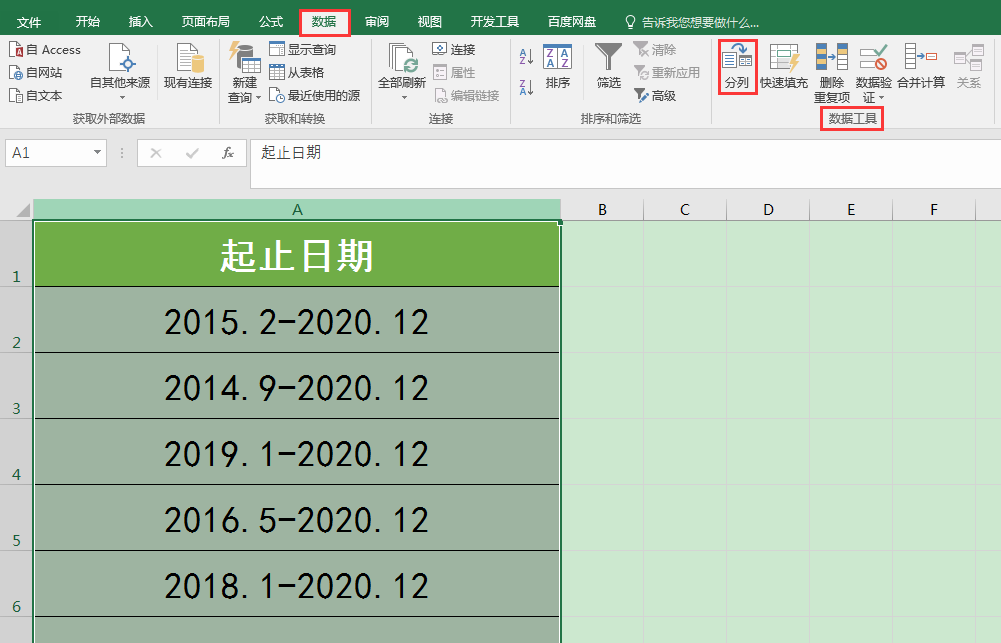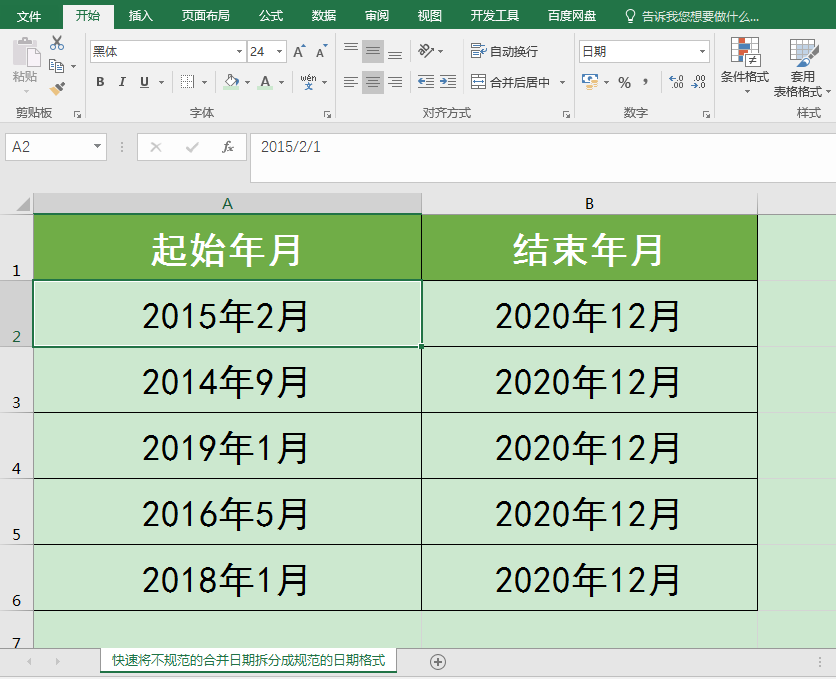 8.这样原来合并在一个单元格中的两个日期就分别拆成单独的列了,并且显示为规范的日期格式。