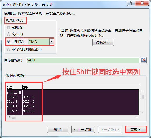 6.4、在弹出的"文本分列向导-第3步,共3步"对话框中,按住键盘上的Shift键同时选中"数据预览"区域的两列数据,在上方的"列数据格式"中选择"日期",单击对话框右下角的"完成"按钮