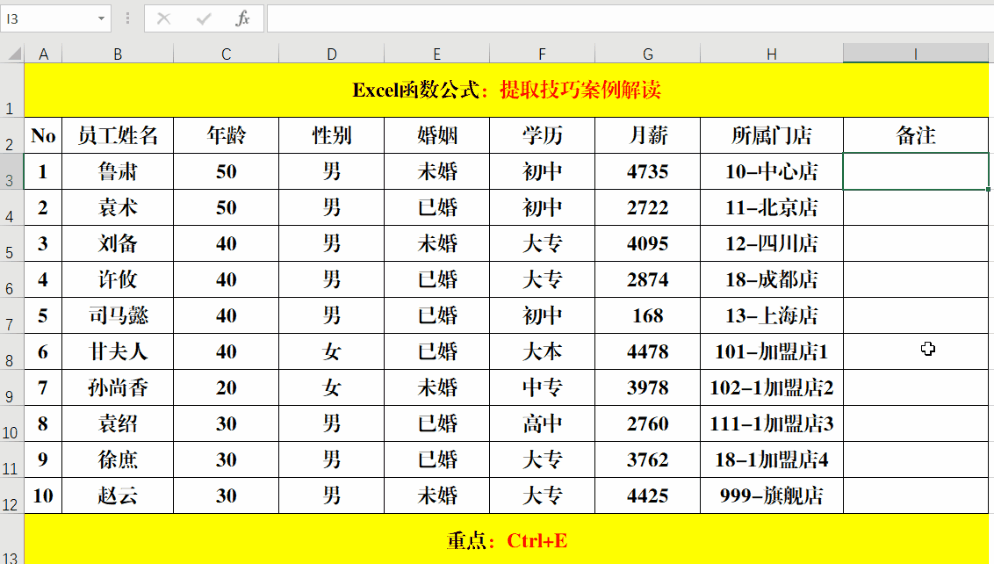 从示例中可以看出,目的是提取门店的编号,但无论在目标单元格中输入1个值,还是2个值,都得不到正确的结果,但快速填充快捷键Ctrl+E的用法是完全正确,没有错误的……究其原因,就是Excel系统无法理解此时的逻辑关系。