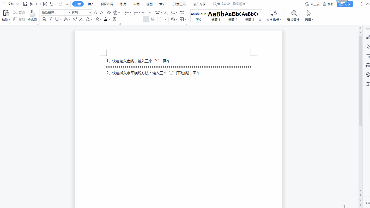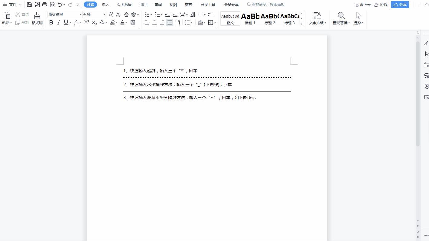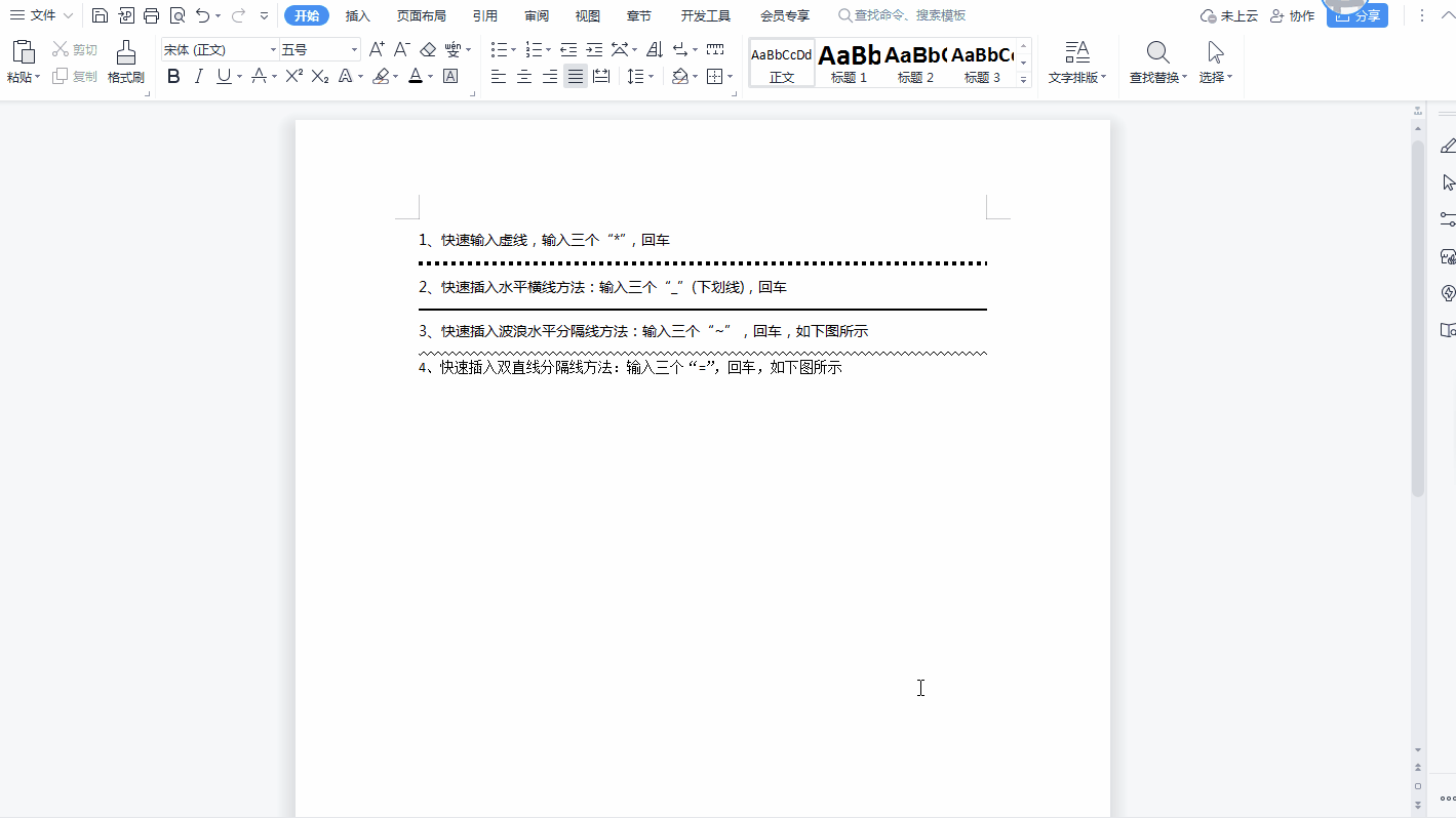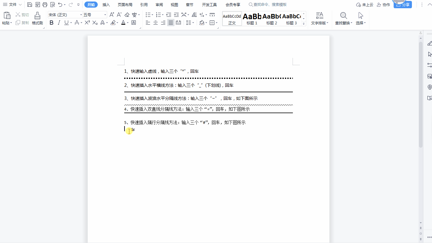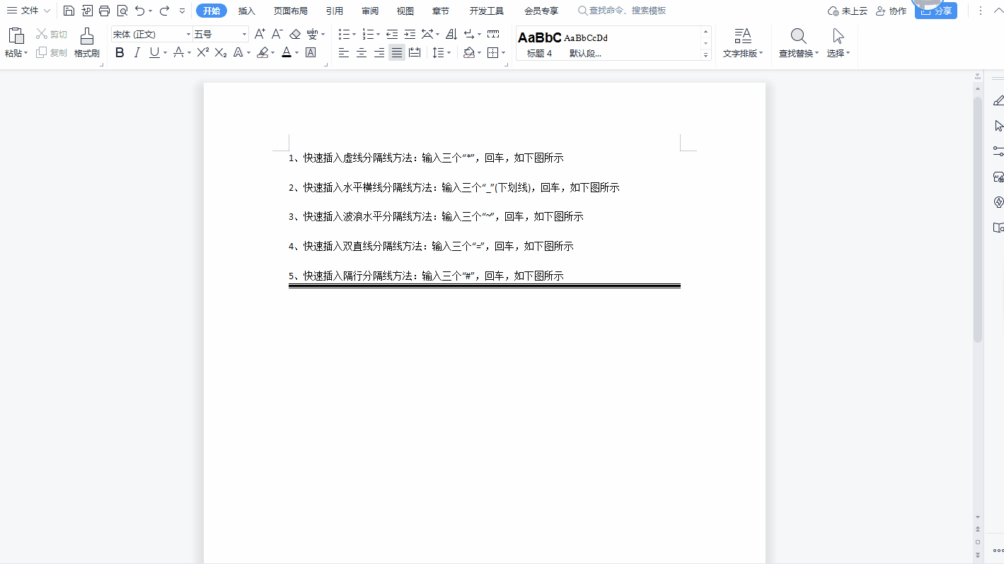 以上就是几种快速插入不同类型的分割线的方法,需要大家注意的是,我们在输入这些符号的时候,一定要另起一行,中间不要加空格,在开头连续输入,然后再敲回车键即可。
