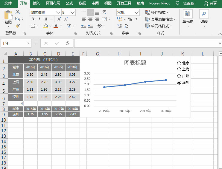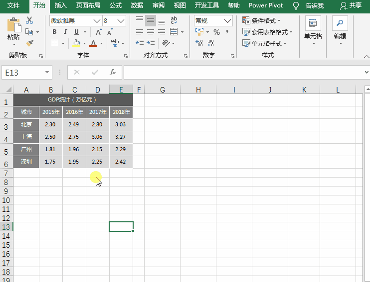 原始数据2015年-2018年北上广深四大城市的GDP数据,其中数据位于B3:E6单元格中。