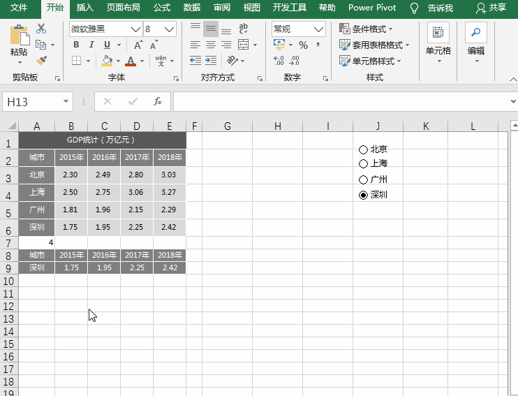 复制出3个按钮控件,分别重命名为城市“上海”、“广州”、“深圳”;选择4个控件,调整大小和位置,右键“组合”;这样单击选择各个城市,链接的单元格分别显示1-4的数字。