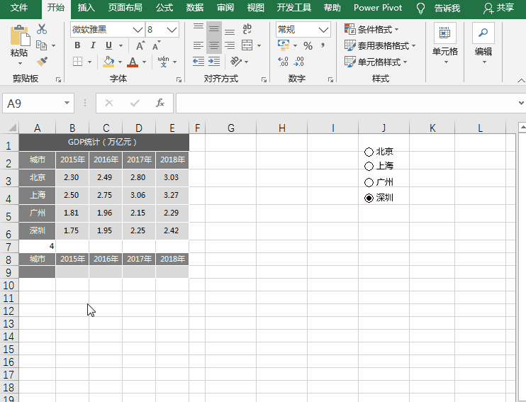 当选择框为第2个城市上海,即链接的单元格A7为2时,B9:E9单元格中的数值=B4:E4;