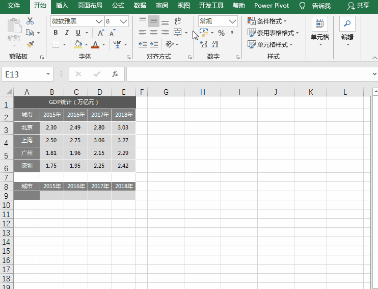 选择源表格A2:E3中的内容,按住Ctrl键拖动复制到A8:E9中,并删除其中的A9:E9中的数据。如下所示,上侧为原表格,下侧为复制后的表格部分表头: