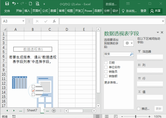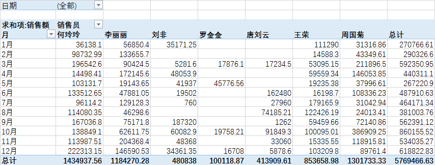4.2、接着在新的工作表中,将字段销售员拖到列中,销售额拖入到值中,日期拖入到行中