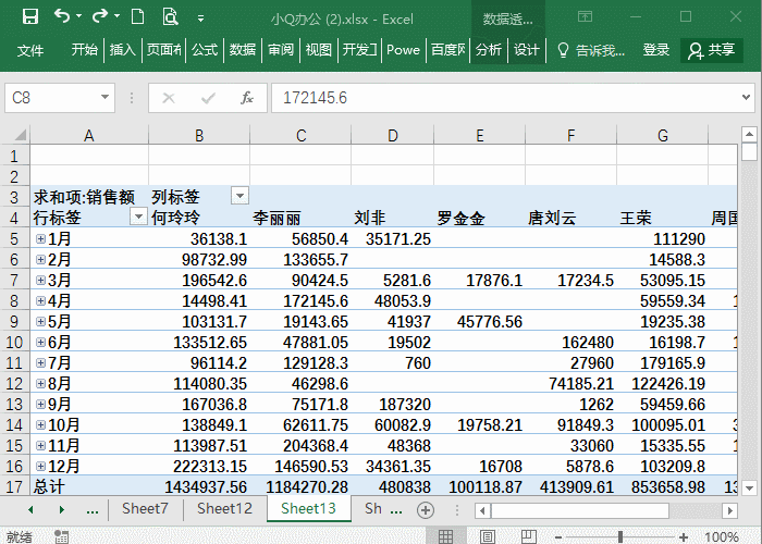 6.经过以上的步骤就完成数据透视表数据汇总,这个方法适合数据比较多的时候,整理和汇总表格