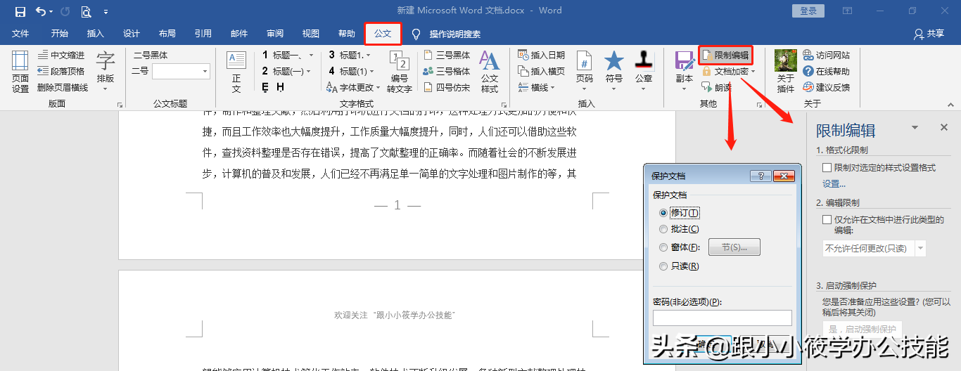 一篇论文通常是2个或多个人一起完成,此时为了防止自己写的内容被修改,你可以选择“保护文档”。点击“限制编辑”,弹出“限制编辑”窗口和“保护文档”对话框,可设置密码进行文档保护。