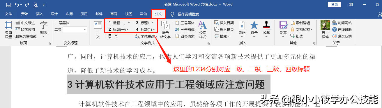 选中要添加标题的文字,点击菜单栏的“公文”选项卡,在“文字格式”工具组中即可快速添加一级标题、二级标题、三级标题、四级标题。不用再担心把标题的顺序搞错了。
