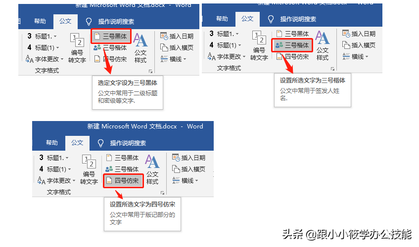 选定文字设为三号黑体/三号楷体/四号仿宋