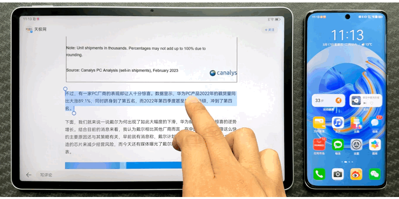 在华为MatePad 11英寸 2023款上,你可以自如地操作登录了同一华为账号的手机,在平板和手机之间随意拖拽文件,也可以实现一台设备复制文字,再到另一台设备上粘贴文字。这些都属于多屏协同的基础操作。倘若你还没有试过多屏协同,小编建议到线下店铺先去试一下,多设备间信息与文件的丝滑流传一定能让你充分感受到科技创新的极致魅力。