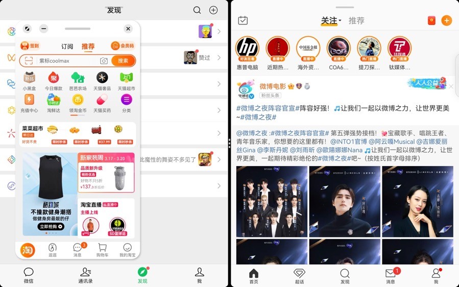 在一个应用底部向上滑动,滑向左上方是分屏,滑向右上方是开启浮窗。一般来说,我习惯于打开微信,另一侧要么是微博,要么是浏览器,或者是备忘录做笔记。有时候还会打开浮窗,进淘宝刷一刷。