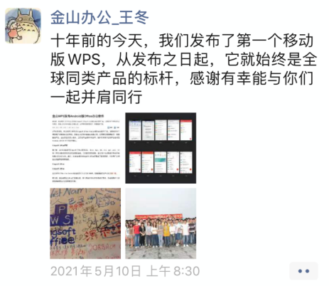 2021年刚好是WPS移动版十周年,王冬发朋友圈致谢