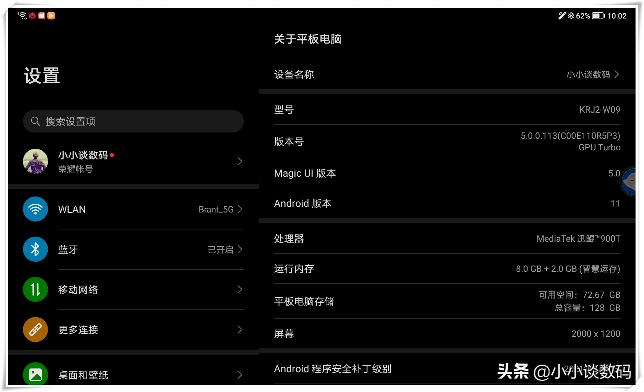 下拉快捷开关 3.屏幕显示设置 荣耀平板V7并没有色彩模式供你选择,可以自己去设定色温,休眠模式(LCD屏幕可以选择永不休眠),电子书模式,深色模式等,支持自定义字体大小和显示大小,不过不支持字体粗细调整。支持智能分辨率和智能刷新率,不过默认建议高分辨率+高刷新率模式,还能显示实时网速情况。