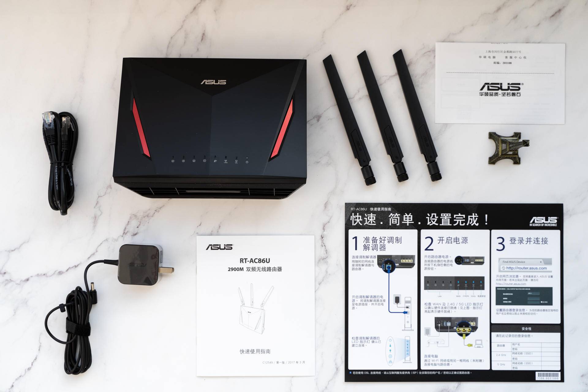 闲话还是少说,惯例了解一下硬件,再说功能这事儿。整个开箱过程极其简略,符合了sir对路由器这种功能性设备的基础认知,主机+千兆网线+三根高增益天线+电源,没了。