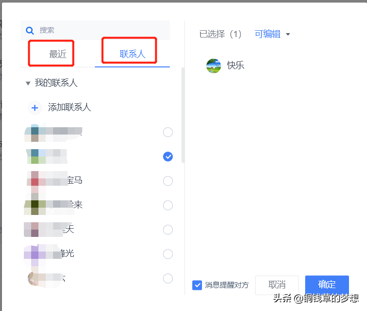4、可以在最近的好友或联系人中选择协作者,右侧有参与协作者列表。点击确定即可完成设置。