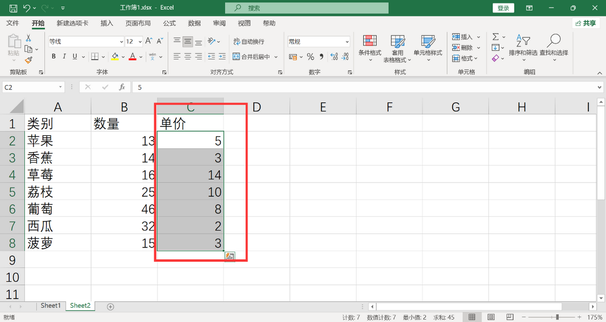 选中第一个单元格和下方所有空白单元格,在键盘上按下”CTRL+E“,批量提取出每行的数量和单价。