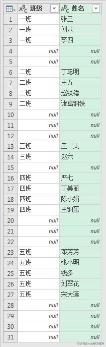 将下图 1 中所有合并的姓名单元格拆分成开来,每个姓名一行,排列成与班级一一对应的表格。效果如下图 2 所示。