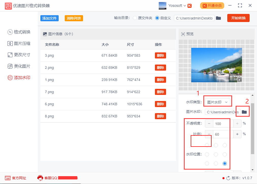 步骤3,然后在软件右下方进行设置,水印类型选择“图片水印”;然后再添加二维码图片;最后设置二维码的不透明度/大小比例/位置等,在上面可以预览到添加二维码后的图片。
