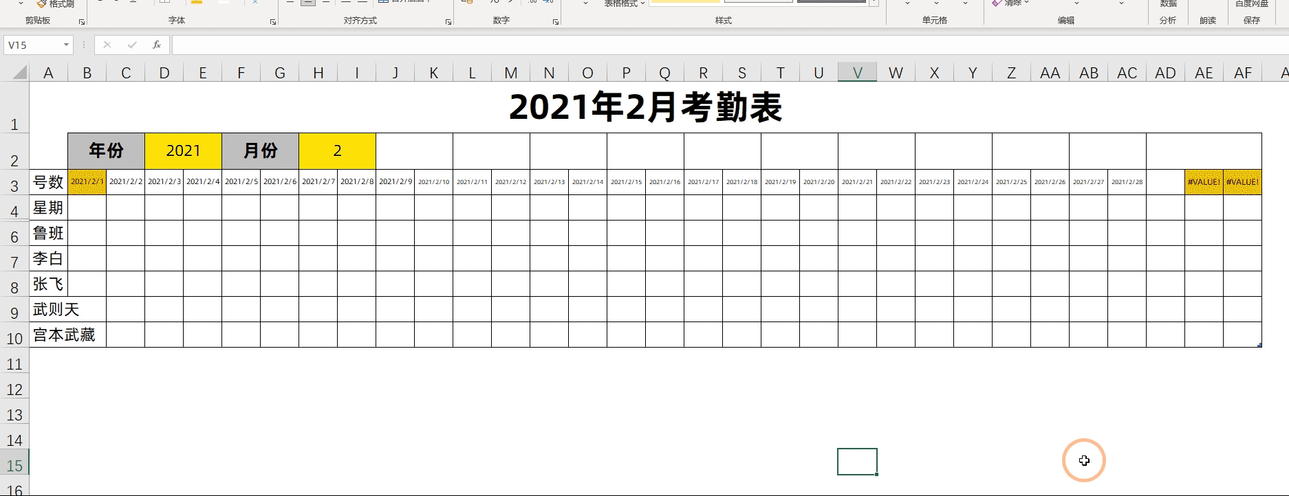 首先我们需要在表格中构建出输入年份和月份的单元格,如下图黄色单元格所示